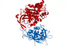 ![]() Crystal structure of protein Z-dependent peptidase inhibitor (red) in complex with protein Z (blue). Rendered from PDB 3F1S | |||||||