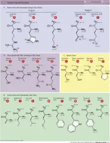 Proteins are polymer chains made of amino acids linked together by peptide bonds. During human digestion, proteins are broken down in the stomach to smaller polypeptide chains via hydrochloric acid and protease actions. This is crucial for the absorption of the essential amino acids that cannot be biosynthesized by the body.[3]