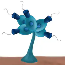 As a member of the Codonosigidae family, Proterospongia have only a fine investment that is indistinct by light microscopy or completely lack an outer-covering.[3][4] Proterospongia species are distinguished by colony morphology, which vary from simple chains of cells to striking astral assemblages.[5] Colonies having extracellular jelly or mucilage have been described by Kent, Lackey, and Leadbeater; however the composition of this substance is unknown.[3][4][5][6] Kent also described a Proterospongia species containing two types of cells embedded in mucilage; however, this is the only account of such a species and it has been suggested that the observed amoeboid cells were actually posterior tentacles that are present on some choanoflagellates.