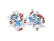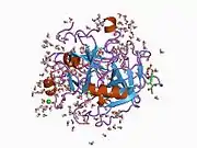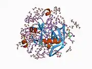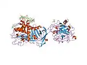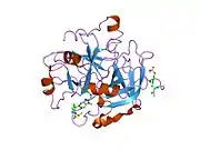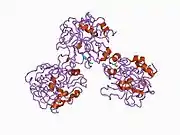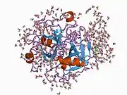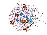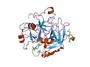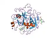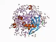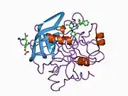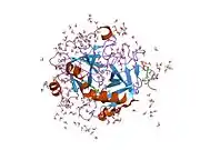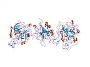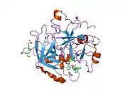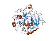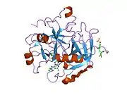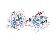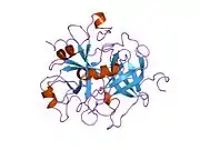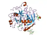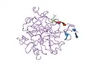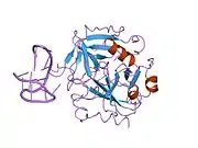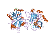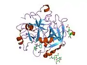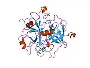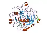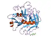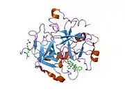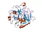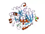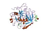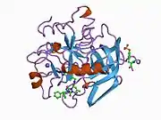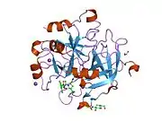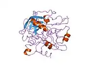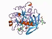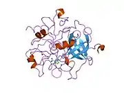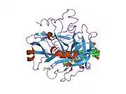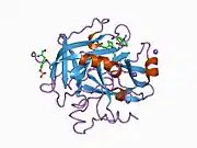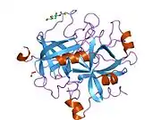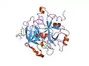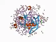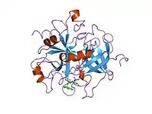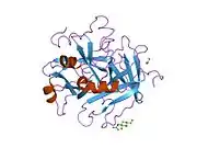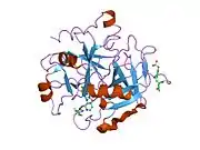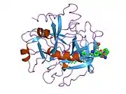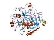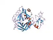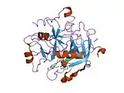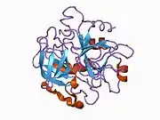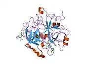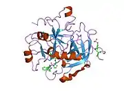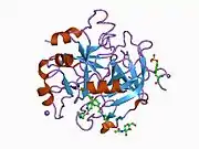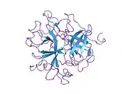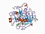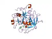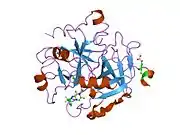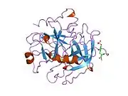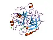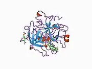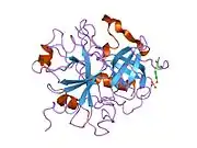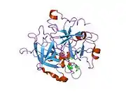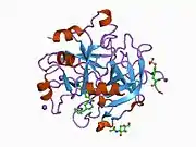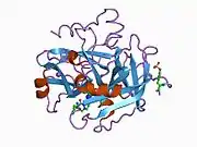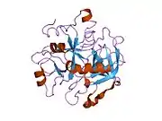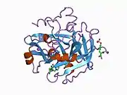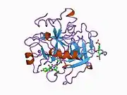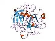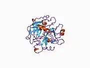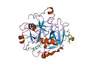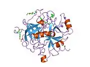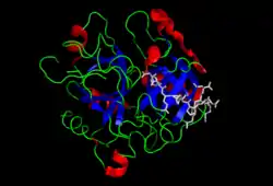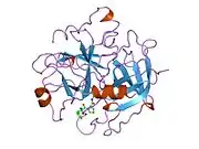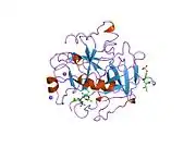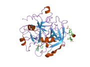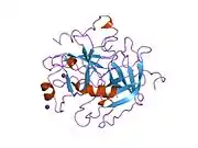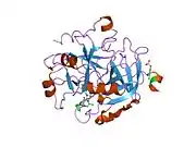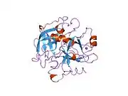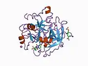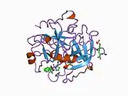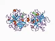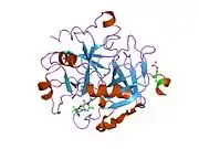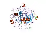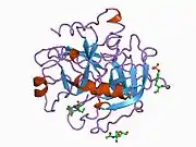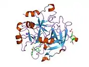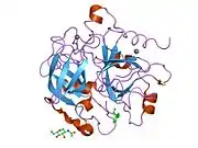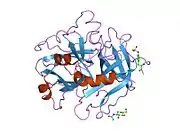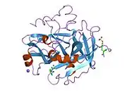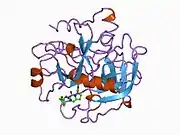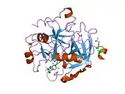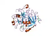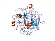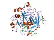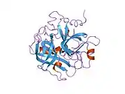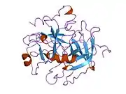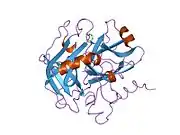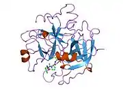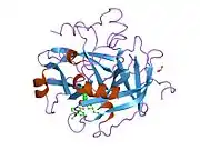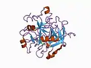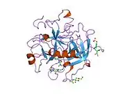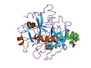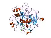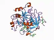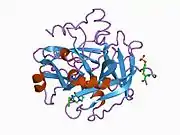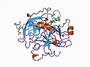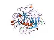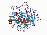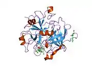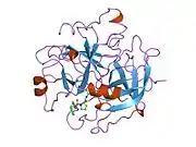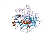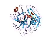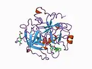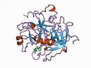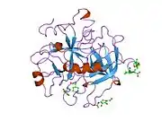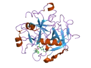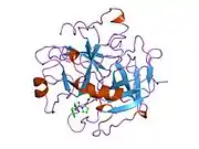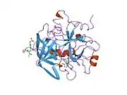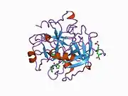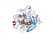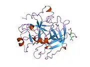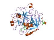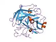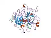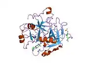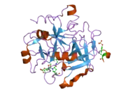 Thrombin (EC 3.4.21.5, fibrinogenase, thrombase, thrombofort, topical, thrombin-C, tropostasin, activated blood-coagulation factor II, blood-coagulation factor IIa, factor IIa, E thrombin, beta-thrombin, gamma-thrombin) is a serine protease, an enzyme that, in humans, is encoded by the F2 gene.[5][6] Prothrombin (coagulation factor II) is proteolytically cleaved to form thrombin in the clotting process. Thrombin in turn acts as a serine protease that converts soluble fibrinogen into insoluble strands of fibrin, as well as catalyzing many other coagulation-related reactions.