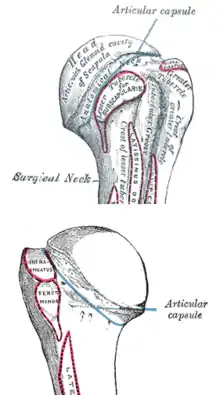The anterior and posterior humeral circumflex arteries branch off of the axillary artery to provide the majority of the blood supply to the proximal humerus.[11]