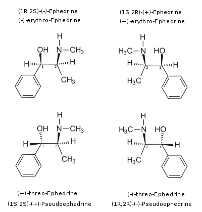 Two pairs of enantiomers: ephedrine (top) and pseudoephedrine (bottom)