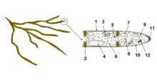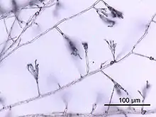 A hypha (plural hyphae, from Greek ὑφή, huphḗ, "web") is a long, branching filamentous structure of a fungus, oomycete, or actinobacterium.[1] In most fungi, hyphae are the main mode of vegetative growth, and are collectively called a mycelium.