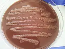 While the microbial colonies of P. stutzeri can alter based on what medium the bacterium is grown on, there are conserved, distinguishable characteristics that are apparent in almost every colony of this species.[10] When examined on solid media, this bacterium has dry, rigid colonies that cling together so tightly it is often easier to remove an entire colony, if needed, rather than just a piece of one.[10] The color of the colonies is usually brown, although it can deviate with a change in media.[12] The shape of each colony mimics that of a crater because the exterior edges are raised, forming a depression in the center.[10] The edges of each colony project outwards often allowing colonies to come into contact with one another.[10]