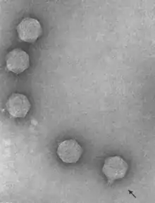 | Electron micrograph of bacteriophage gh-1 negatively stained with uranyl acetate. Magnification X 300,000. Two fibers attached to the wedge-shaped tail are visible on the bacteriophage, as indicated by an arrow. | |