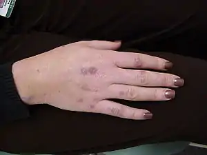 | Healing blisters on the hand of a woman using naproxen and tanning booth | |