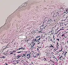 | Upper dermal elastolysis | LM: Complete loss of elastic fibers in the upper dermis |