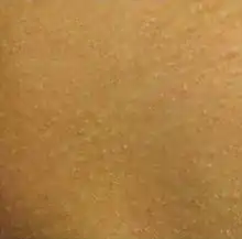 | Pseudoxanthoma elasticum of the posterior lateral neck. Note the yellowish slightly raised bumps characteristic of this condition. | |