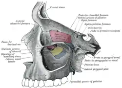 In human anatomy, the pterygopalatine fossa (sphenopalatine fossa) is a fossa in the skull. A human skull contains two pterygopalatine fossae—one on the left side, and another on the right side. Each fossa is a cone-shaped paired depression deep to the infratemporal fossa and posterior to the maxilla on each side of the skull, located between the pterygoid process and the maxillary tuberosity close to the apex of the orbit.[1] It is the indented area medial to the pterygomaxillary fissure leading into the sphenopalatine foramen. It communicates with the nasal and oral cavities, infratemporal fossa, orbit, pharynx, and middle cranial fossa through eight foramina.[2]