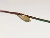 The eggs of the crab louse are laid usually on the coarse hairs of the genital and perianal regions of the human body. The female lays about three eggs a day. The eggs take 6–8 days to hatch, and there are three nymphal stages which together take 10–17 days before the adult develops, making a total life cycle from egg to adult of 16–25 days. Adults live for up to 30 days.[6] Crab lice feed exclusively on blood, and take a blood meal 4–5 times daily. Outside the host they can survive for 24–48 hours. Pubic lice are transmitted from person to person most-commonly via sexual contact, although fomites (bedding, clothing) may play a minor role in their transmission.[7]