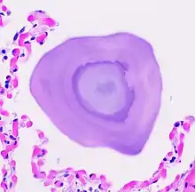 PAM may be confined to certain areas or show diffuse distribution through the lungs.[6] Lung biopsy and autopsy specimens demonstrate characteristic intra-alveolar lamellar microliths.[6][14] Calcium deposits in the alveoli begin in the lower lobes and spread over a period of years throughout the lungs.[3]