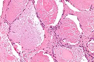 | Micrograph of pulmonary alveolar proteinosis, showing the characteristic airspace filling with focally dense globs referred to as chatter or dense bodies. H&E stain. | |