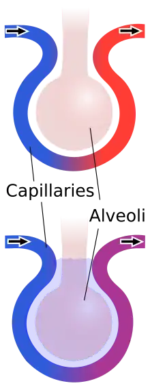 In contusions, torn capillaries leak fluid into the tissues around them.[33] The membrane between alveoli and capillaries is torn; damage to this capillary–alveolar membrane and small blood vessels causes blood and fluids to leak into the alveoli and the interstitial space (the space surrounding cells) of the lung.[11] With more severe trauma, there is a greater amount of edema, bleeding, and tearing of the alveoli.[17] Pulmonary contusion is characterized by microhemorrhages (tiny bleeds) that occur when the alveoli are traumatically separated from airway structures and blood vessels.[24] Blood initially collects in the interstitial space, and then edema occurs by an hour or two after injury.[30] An area of bleeding in the contused lung is commonly surrounded by an area of edema.[24] In normal gas exchange, carbon dioxide diffuses across the endothelium of the capillaries, the interstitial space, and across the alveolar epithelium; oxygen diffuses in the other direction. Fluid accumulation interferes with gas exchange,[34] and can cause the alveoli to fill with proteins and collapse due to edema and bleeding.[24] The larger the area of the injury, the more severe respiratory compromise will be.[17]