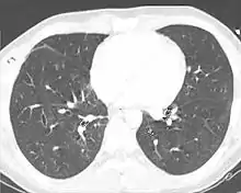 A large amount of force is required to cause pulmonary contusion; a person injured with such force is likely to have other types of injuries as well.[23] In fact, pulmonary contusion can be used to gauge the severity of trauma.[25] Up to three quarters of cases are accompanied by other chest injuries,[39] the most common of these being hemothorax and pneumothorax.[37] Flail chest is usually associated with significant pulmonary contusion,[15] and the contusion, rather than the chest wall injury, is often the main cause of respiratory failure in people with these injuries.[69] Other indications of thoracic trauma may be associated, including fracture of the sternum and bruising of the chest wall.[63] Over half of fractures of the scapula are associated with pulmonary contusion.[27] The contusion is frequently found underlying fracture sites.[35] When accompanied by a fracture, it is usually concentrated into a specific location—the contusion is more diffuse when there is no fracture.[31][43] Pulmonary lacerations may result from the same blunt or penetrating forces that cause contusion.[6] Lacerations can result in pulmonary hematomas; these are reported to develop in 4–11% of pulmonary contusions.[6]