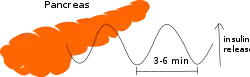 Oscillations of intracellular calcium concentration in beta cells within the pancreas produces a basal pulsatile secretion of insulin form the pancreas. Secretion pulses emanating form free beta cells not located within an islet of Lagerhans have been observed to be highly variable (2 to 10 minutes). Beta cells within an islet, however, become synchronized via electrical coupling resulting from gap junctions and osculate more regularly (3 to 6 minutes). ATP signalling has also been proposed as a method of coordination between beta cells.