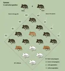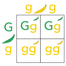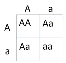 The Punnett square is a square diagram that is used to predict the genotypes of a particular cross or breeding experiment. It is named after Reginald C. Punnett, who devised the approach in 1905.[3][4][5][6][7][8] The diagram is used by biologists to determine the probability of an offspring having a particular genotype. The Punnett square is a tabular summary of possible combinations of maternal alleles with paternal alleles.[9] These tables can be used to examine the genotypical outcome probabilities of the offspring of a single trait (allele), or when crossing multiple traits from the parents. The Punnett square is a visual representation of Mendelian inheritance. It is important to understand the terms "heterozygous", "homozygous", "double heterozygote" (or homozygote), "dominant allele" and "recessive allele" when using the Punnett square method. For multiple traits, using the "forked-line method" is typically much easier than the Punnett square. Phenotypes may be predicted with at least better-than-chance accuracy using a Punnett square, but the phenotype that may appear in the presence of a given genotype can in some instances be influenced by many other factors, as when polygenic inheritance and/or epigenetics are at work.