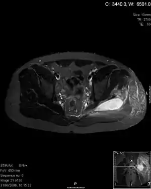 | Transverse T2 magnetic resonance imaging section through the hip region showing abscess collection in a patient with pyomyositis. | |