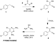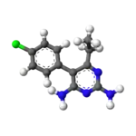 Pyrimethamine, sold under the brand name Daraprim among others, is a medication used with leucovorin to treat the parasite diseases toxoplasmosis and cystoisosporiasis.[3][4] It is also used with dapsone as a second-line option to prevent Pneumocystis jiroveci pneumonia in people with HIV/AIDS.[3] It was previously used for malaria but is no longer recommended due to resistance.[3] Pyrimethamine is taken by mouth.[3]