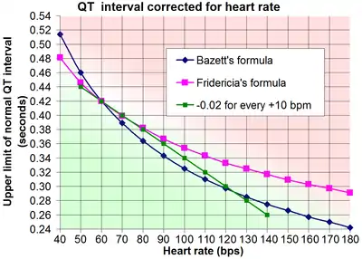Upper limit of normal QT interval, corrected for heart rate according to Bazett's formula,[5] Fridericia's formula,[11] and subtracting 0.02 s from QT for every 10 bpm increase in heart rate.[14] Up to 0.42 s (≤ 420 ms) is chosen as normal QTc of QTB and QTF in this diagram.[15]