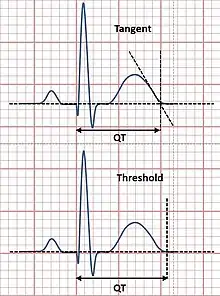 The QT interval is most commonly measured in lead II for evaluation of serial ECGs, with leads I and V5 being comparable alternatives to lead II. Leads III, aVL and V1 are generally avoided for measurement of QT interval.[1] The accurate measurement of the QT interval is subjective[2] because the end of the T wave is not always clearly defined and usually merges gradually with the baseline. QT interval in an ECG complex can be measured manually by different methods, such as the threshold method, in which the end of the T wave is determined by the point at which the component of the T wave merges with the isoelectric baseline, or the tangent method, in which the end of the T wave is determined by the intersection of a tangent line extrapolated from the T wave at the point of maximum downslope to the isoelectric baseline.[3]