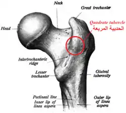 The quadrate tubercle is located about the junction of the upper one-third and lower two-thirds, on the intertrochanteric crest. In a small anatomical study, it was shown that the epiphysial line passes directly through the quadrate tubercle.[1] The quadrate tubercle is the site of insertion of the quadratus femoris muscle.[2]