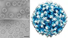 | (Left) Electron micrographs of the Rosellinia necatrix quadrivirus 1 Bar, 50 nm. (Right) Three-dimensional cryo-electron microscopy reconstruction of RnQV1 virions at 8Å resolution. | |