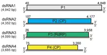 Family member genomes are composed of double-stranded RNA. They are divided in to four segments which each code for a protein. The length of the different segments are between 3.5 to 5.0 kbp. The total genome is around 16.8 kbp. Inside the capsid with the genome there is also the RNA-dependent RNA polymerase.[2][3]
