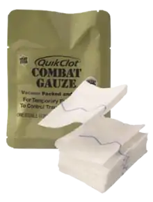 Using zeolite as a clotting agent was discovered by Frank Hursey (Z-Medica co-founder) in 1984.[3] Following the September 11 attacks the US armed forces conducted a series of tests comparing different antihemorrhagic technologies, in which QuikClot got the best score.[4][5] Following these tests, the US armed forces approved its use in Afghanistan and Iraq. QuikClot Combat Gauze utilizes the clotting properties of kaolin to help control and stop bleeding. Kaolin works by activating factor XII, a protein factor which assists in the initiation of the coagulation cascade, a protein chain reaction which promotes blood clotting as a result of trauma. The active nature of kaolin in the promotion of this process causes it to happen much earlier on than normal, but also at a faster rate.[6][7] In 2008, QuikClot Combat Gauze with kaolin was chosen by the CoTCCC (Committee on Tactical Combat Casualty Care) as the only hemostatic dressing to be used by all branches of the US military for compressible hemorrhage not amenable to tourniquet use or as an adjunct to tourniquet removal if evacuation time is anticipated to be longer than 2 hours.[8] Today, QuikClot Combat Gauze is still the hemostatic device of choice of all branches of the military by the CoTCCC. The Department of Defense is funding research to explore other applications of QuikClot products in bleeding associated with traumatic injuries.