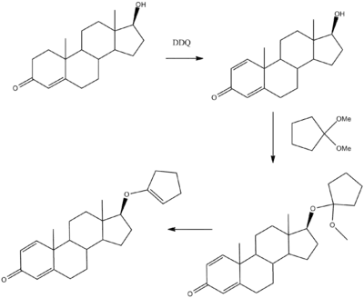 Quinbolone can be prepared from testosterone. Dehydrogenation using DDQ forms boldenone. Reaction with 1,1-dimethoxycyclopentane followed by heating to eliminate methanol gives quinbolone.