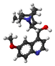 Quinine is a medication used to treat malaria and babesiosis.[4] This includes the treatment of malaria due to Plasmodium falciparum that is resistant to chloroquine when artesunate is not available.[4][5] While sometimes used for restless legs syndrome, quinine is not recommended for this purpose due to the risk of serious side effects.[4] It can be taken by mouth or intravenously.[4] Malaria resistance to quinine occurs in certain areas of the world.[4] Quinine is also the ingredient in tonic water that gives it its bitter taste.[6]