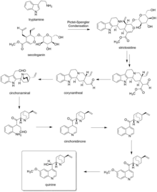 In the first step of quinine biosynthesis, the enzyme strictosidine synthase catalyzes a stereoselective Pictet–Spengler reaction between tryptamine and secologanin to yield strictosidine.[39][40] Suitable modification of strictosidine leads to an aldehyde. Hydrolysis and decarboxylation would initially remove one carbon from the iridoid portion and produce corynantheal. Then the tryptamine side-chain were cleaved adjacent to the nitrogen, and this nitrogen was then bonded to the acetaldehyde function to yield cinchonaminal. Ring opening in the indole heterocyclic ring could generate new amine and keto functions. The new quinoline heterocycle would then be formed by combining this amine with the aldehyde produced in the tryptamine side-chain cleavage, giving cinchonidinone. For the last step, hydroxylation and methylation gives quinine.[41][42]