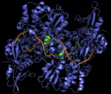 Quinolones are chemotherapeutic bactericidal drugs. They interfere with DNA replication by preventing bacterial DNA from unwinding and duplicating.[62] Specifically, they inhibit the ligase activity of the type II topoisomerases, DNA gyrase and topoisomerase IV, which cut DNA to introduce supercoiling, while leaving nuclease activity unaffected. With the ligase activity disrupted, these enzymes release DNA with single- and double-strand breaks that lead to cell death.[63] The majority of quinolones in clinical use are fluoroquinolones, which have a fluorine atom attached to the central ring system, typically at the 6-position or C-7 position. Most of them are named with the -oxacin suffix. First and second generation quinolones are largely active against Gram-negative bacteria, whereas third and fourth generation quinolones have increased activity against Gram-positive and anaerobic bacteria.[64] Some quinolones containing aromatic substituents at their C-7 positions are highly active against eukaryotic type II topoisomerase.[65]