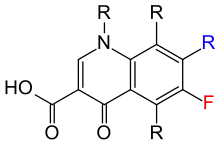 The basic pharmacophore, or active structure, of the fluoroquinolone class is based upon the quinoline ring system.[70] Various substitutions made to the quinoline ring resulted in the development of numerous fluoroquinolone drugs. The addition of the fluorine atom at C-6 distinguishes the successive-generation fluoroquinolones from the first-generation quinolones, although examples are known that omit the atom while retaining antibacterial activity.[52]