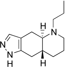 Quinpirole is a psychoactive drug and research chemical which acts as a selective D2 and D3 receptor agonist. It is used in scientific research.[1][2][3] Quinpirole has been shown to increase locomotion and sniffing behavior in mice treated with it. At least one study has found that quinpirole induces compulsive behavior symptomatic of obsessive compulsive disorder in rats.[4] Another study in rats show that quinpirole produces significant THC-like effects when metabolic degradation of anandamide is inhibited, supporting the hypothesis that these effects of quinpirole are mediated by cannabinoid CB1 receptors.[5] Quinpirole may also reduce relapse in adolescent rat models of cocaine addiction.[6]