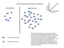The quorum-sensing function is based on the local density of the bacterial population in the immediate environment.[7] It can occur within a single bacterial species, as well as between diverse species. Both Gram-positive and gram-negative bacteria use quorum sensing, but there are some major differences in their mechanisms.[8]