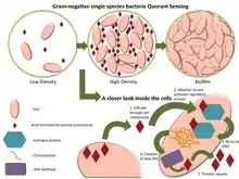The opportunistic pathogen Pseudomonas aeruginosa uses quorum sensing to coordinate the formation of biofilm, swarming motility, exopolysaccharide production, virulence, and cell aggregation.[18] These bacteria can grow within a host without harming it until they reach a threshold concentration. Then they become aggressive, developing to the point at which their numbers are sufficient to overcome the host's immune system, and form a biofilm, leading to disease within the host as the biofilm is a protective layer encasing the bacterial population. Another form of gene regulation that allows the bacteria to rapidly adapt to surrounding changes is through environmental signaling. Recent studies have discovered that anaerobiosis can significantly impact the major regulatory circuit of quorum sensing. This important link between quorum sensing and anaerobiosis has a significant impact on the production of virulence factors of this organism.[19] It is hoped that the therapeutic enzymatic degradation of the signaling molecules will prevent the formation of such biofilms and possibly weaken established biofilms. Disrupting the signaling process in this way is called quorum sensing inhibition.