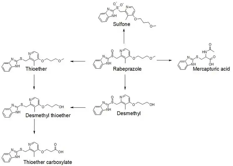 Rabeprazole is extensively metabolized by the liver.[3] 90% of the drug is rendered into metabolites by the liver, which are then excreted by the kidneys.[4] 10% of the dose is excreted in the feces.[2] The drug metabolizing enzymes primarily responsible for rabeprazole's metabolism are CYP2C19 and CYP3A4.[3] However, rabeprazole is mainly metabolized through non-enzymatic reduction to a thioether metabolite.[2] Some of rabeprazole's metabolites include the following: a thioether carboxylic acid metabolite, a thioether glucuronide metabolite, and a sulfone metabolite.[3] The most common metabolites excreted in the urine are the mercapturic acid conjugate and carboxylic acid.[2] A diagram of rabeprazole's phase I metabolism is shown below.[15]