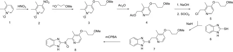 The above synthesis pathway begins with 2,3-dimethypyridine N-oxide (1). Nitration of 2,3-dimethylpyridine N-oxide affords the nitro derivative (the addition of NO2) (2) The newly introduced nitro group is then displaced by the alkoxide from 3-methoxypropanol to yield the corresponding ether (3). Treatment with acetic anhydride results in the Polonovski reaction. Saponification followed by treatment with thionyl chloride then chlorinates the primary alcohol (5). Reaction with benzimidazole-2-thiol (6) followed by oxidation of the resulting thioether to the sulfoxide yields the final product: rabeprazole (8).[24][25]