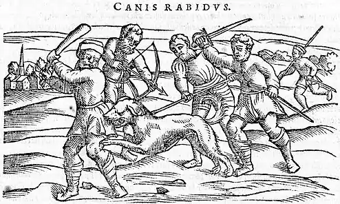 An image from 1566 depicting a group of men using an assortment of weapons to try and kill a rabid dog who is biting one of the men on the leg.