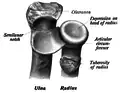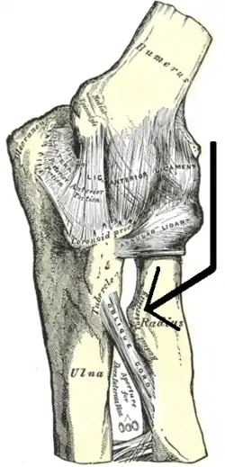 Ligaments that support the elbow joint also attach to the radial tuberosity.[5]