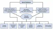 Genomic instability has been observed both in vitro and in vivo in the progeny of cells that are irradiated with heavy ions in several model systems.[19] The presence of chromosomes that are lacking telomeres in the progeny of cells that were exposed to heavy ions is particularly interesting. Sabatier et al.[20][21] found that rearrangements involving telomere regions are associated with chromosomal instability in human fibroblasts that occur many generations after exposure to accelerated heavy ions. Telomere dysfunction plays a crucial role in initiating or sustaining genomic instability, which is a major step in cancer progression. Heavy-ion-induced effects on telomere stability have also been studied using siRNA (small interfering ribonucleic acid) knockdown for components of DNA-dependent protein kinase (DNA-PK) in human lymphoblasts. Differential results were found for gamma rays and HZE nuclei, with iron nuclei being much more effective in producing DSB-telomere fusions after knockdown of DNA-PK.[22] Cells containing telomere-deficient chromosomes will either senesce or undergo breakage-fusion-bridge (B/F/B) cycles, thereby promoting genetic instability. The fate of normal cells that contain a single terminal deletion is unknown, but it has been shown that the loss of a single telomere in cancer cells can result in instability in multiple chromosomes.[23][24] These recent results suggest that telomere instability could be an important early event in the pathway to cancer induction by HZE nuclei.