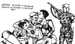 Kangura requested that all Hutu be vigilant against the Tutsi, who they called Inyenzi (cockroaches), as well as those considered accomplices. In an interview with Human Rights Watch one Hutu woman stated, "According to the propaganda, the Tutsi were hiding the enemy. And their beautiful women were being used to do it. So, everybody knew what that meant."[19] Cartoons in print media represented Tutsi women as being sexually provocative. One printed by Kangura depicted the head of the UN peace-keeping forces in an amorous position with two Tutsi women; the caption read, "General Dallaire and his men have fallen into the trap of Femme fatales". Another image portrayed Tutsi women having sex with three Belgian paratroopers.[20] Using both printed press and the Radio Télévision Libre des Mille Collines (RTLMC), propagandists portrayed Tutsi women as "devious seductresses who would undermine the Hutu". Members of the military were barred from marrying Tutsi women, and Tutsi women were portrayed as arrogant, ugly and viewing Hutu men as inferior.[21]