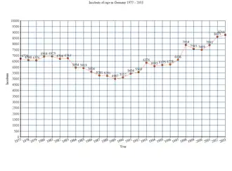 The prevalence of rape in Germany has remained relatively stable, and although the country has the second highest overall number of rapes reported in the EU, the number of reports per capita is average for the region.[11][12] As of 1995 the recorded incidence of rape in Germany was 7.57 per 100,000 people.[13] In 2009, about 7,314 rape cases were reported, a rate of 9 per 100,000 people.[14] In 2011, there were about 7,539 reported cases of rape.[15][14][lower-alpha 3]