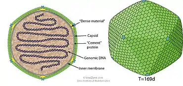 Schematic drawing of a typical Phycodnaviridae virion (cross section and side view)