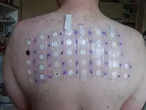| Erythema migrans / Lyme disease | Expands over days or weeks to 5–70 cm (median 16 cm), circular or oval, red or bluish, may have an elevated or darker center, may have a central or ring-like clearing, may feel warm, not painful or itchy[4][5] | Armpit, groin, back of knee, on the trunk, under clothing straps, or in children's hair, ear, or neck[6][7] |