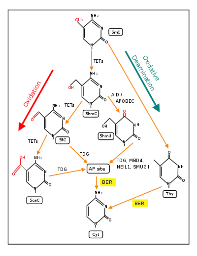 Demethylation of 5-Methylcytosine (5mC) in neuron DNA. As reviewed in 2018,[79] in brain neurons, 5mC is oxidized by the ten-eleven translocation (TET) family of dioxygenases (TET1, TET2, TET3) to generate 5-hydroxymethylcytosine (5hmC). In successive steps TET enzymes further hydroxylate 5hmC to generate 5-formylcytosine (5fC) and 5-carboxylcytosine (5caC). Thymine-DNA glycosylase (TDG) recognizes the intermediate bases 5fC and 5caC and excises the glycosidic bond resulting in an apyrimidinic site (AP site). In an alternative oxidative deamination pathway, 5hmC can be oxidatively deaminated by activity-induced cytidine deaminase/apolipoprotein B mRNA editing complex (AID/APOBEC) deaminases to form 5-hydroxymethyluracil (5hmU) or 5mC can be converted to thymine (Thy). 5hmU can be cleaved by TDG, single-strand-selective monofunctional uracil-DNA glycosylase 1 (SMUG1), Nei-Like DNA Glycosylase 1 (NEIL1), or methyl-CpG binding protein 4 (MBD4). AP sites and T:G mismatches are then repaired by base excision repair (BER) enzymes to yield cytosine (Cyt).
