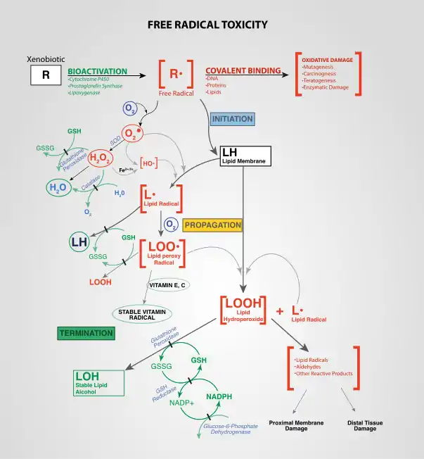 Free radical mechanisms in tissue injury. Free radical toxicity induced by xenobiotics and the subsequent detoxification by cellular enzymes (termination).