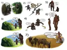 The 'from where to what' model of language evolution hypotheses 7 stages of language evolution.