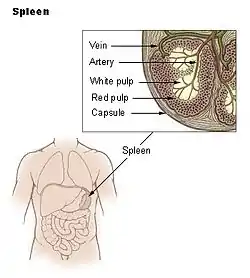 The red pulp of the spleen is composed of connective tissue known also as the cords of Billroth and many splenic sinusoids that are engorged with blood, giving it a red color.[1][2] Its primary function is to filter the blood of antigens, microorganisms, and defective or worn-out red blood cells.[3]