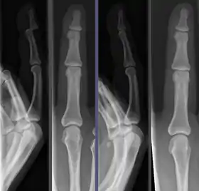 ![]() Joint dislocation in the DIP of the third finger before (left images) and after (right images) reduction. | |